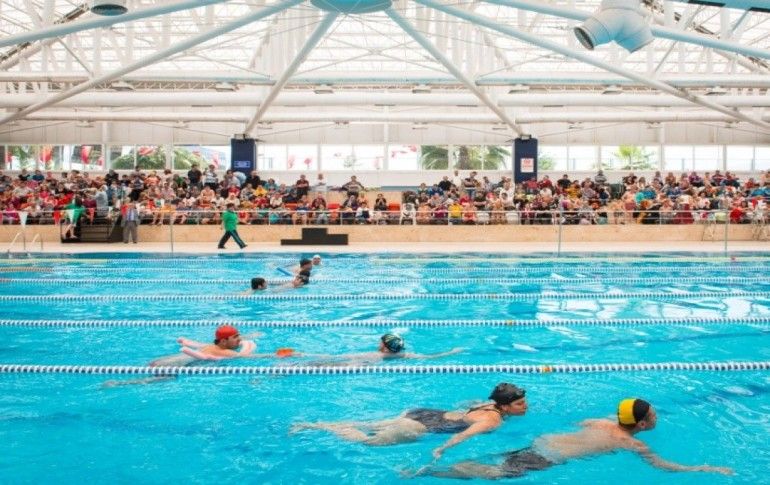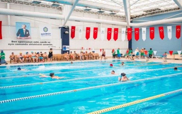 Yüzme kurslarına katılan yaklaşık 250 çocuk yeteneklerini gösterdiler, yarıştılar.